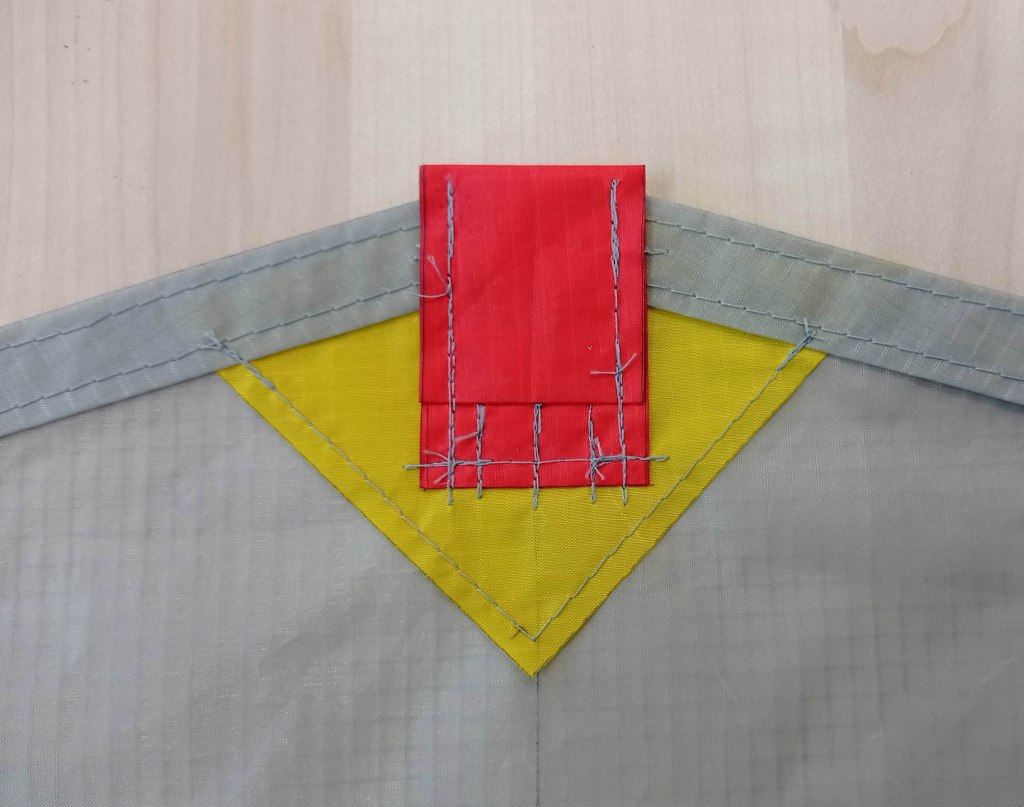 Detail of top-sail centre spar pocket. The pocket is reinforced with two horizontal and three vertical bars of stitching before being sewn down in place with two vertical bars.