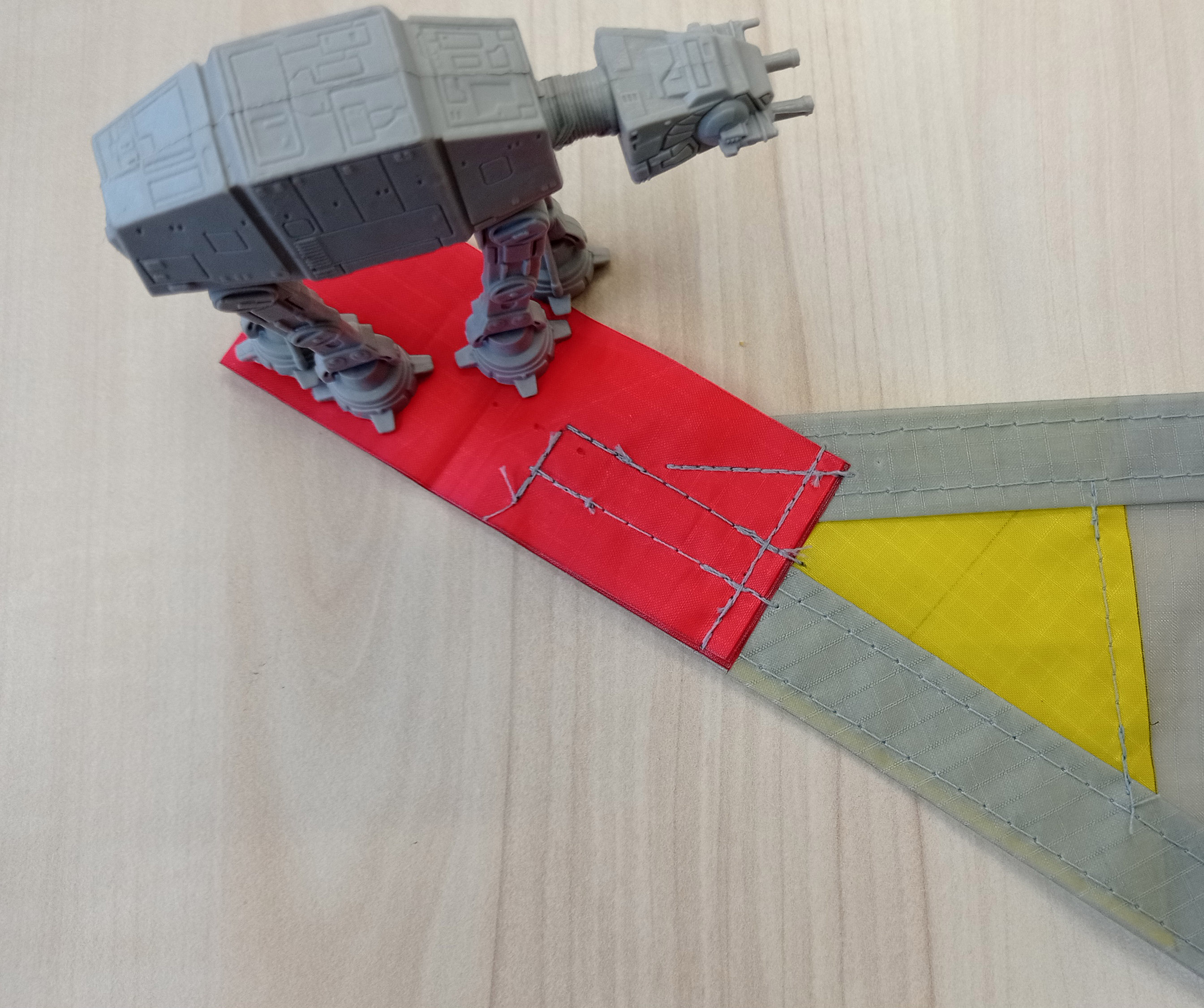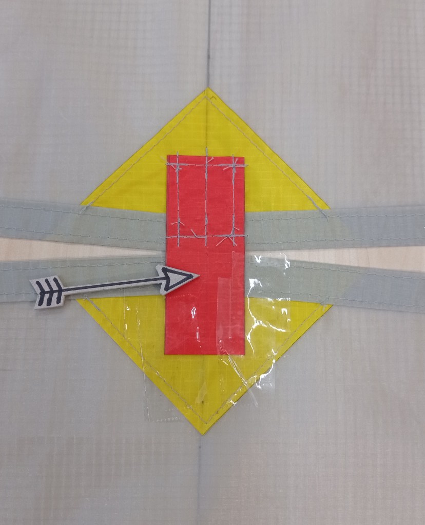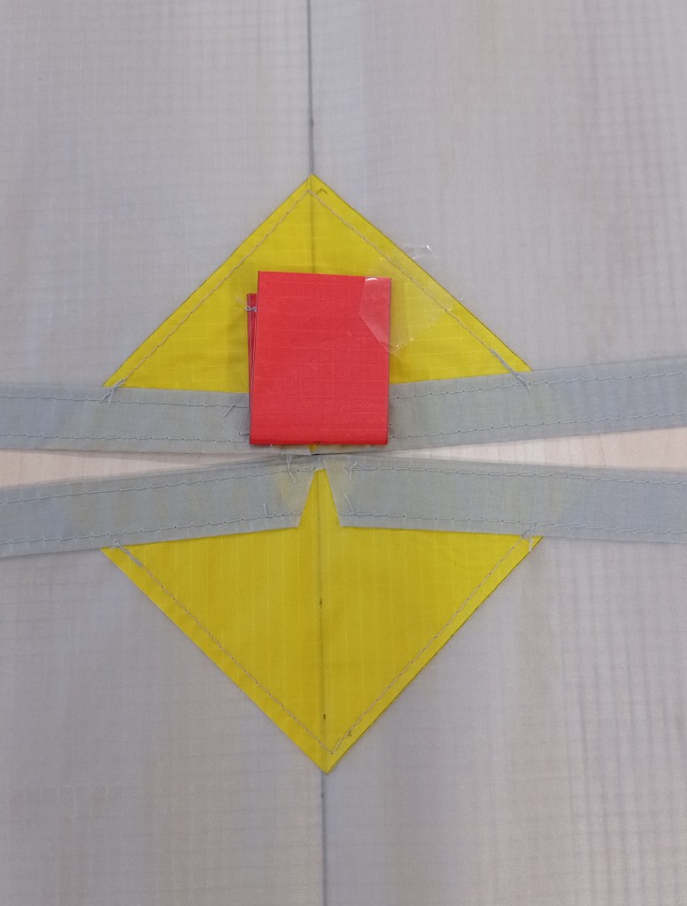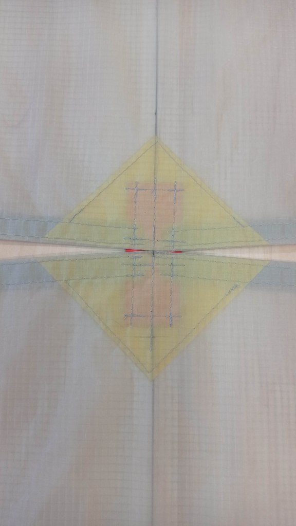 Once the sails have been aligned properly I use Sellotape to stick on a piece of ripstop fabric which is then sewn in place. It’s a simpler method than the sleeved connecting strip.