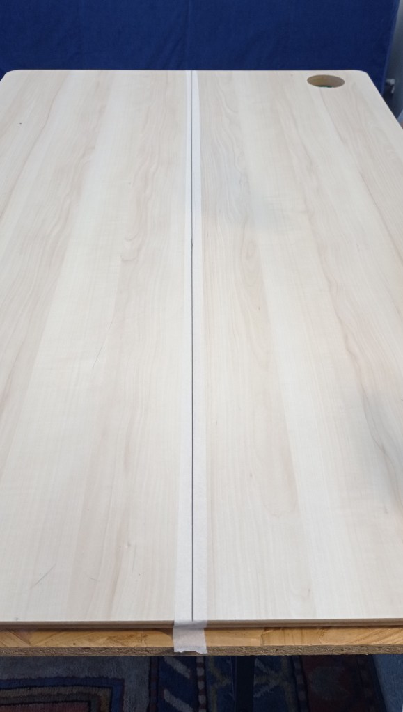 I first make a guide by taping a vertical strip of masking tape to the work-table. Using a steel rule I draw a vertical ink line onto it. This guide will allow me to align both sails correctly.